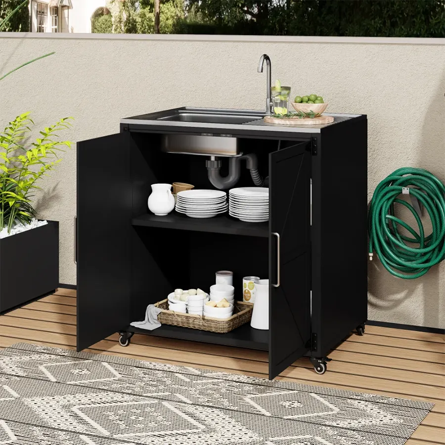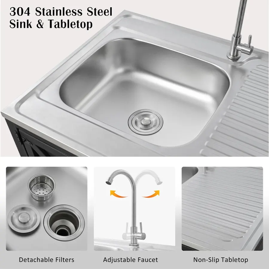 - Outdoor Modular Kitchen Sink Station with Cabinet is crafted from 304 steel and iron makes it durable, preventing the buildup of rust, breakage, or scratches.
